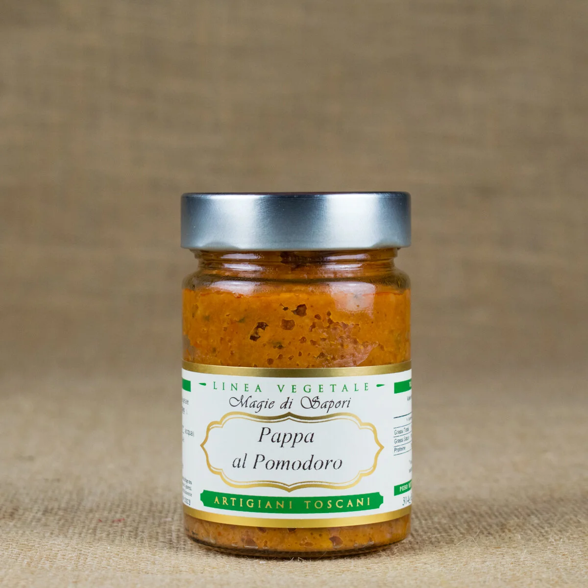 INGREDIENTI: Zucca ITALIA (Valdichiana) 65%, Olio Extra Vergine di Oliva, Guanciale di Suino stagionato 10% (Carne di Suino ITA, Sale, Destrosio, Saccarosio, Spezie e aromi naturali, Antiossidante: E300, Conservanti: E 250 E252), Sale, Preparato per Brodo (sale iodato, grasso vegetale, esaltatore di sapidità, glutammato monosodico, aromi naturali), Pepe, Peperoncino. SENZA CONSERVANTI AGGIUNTI.